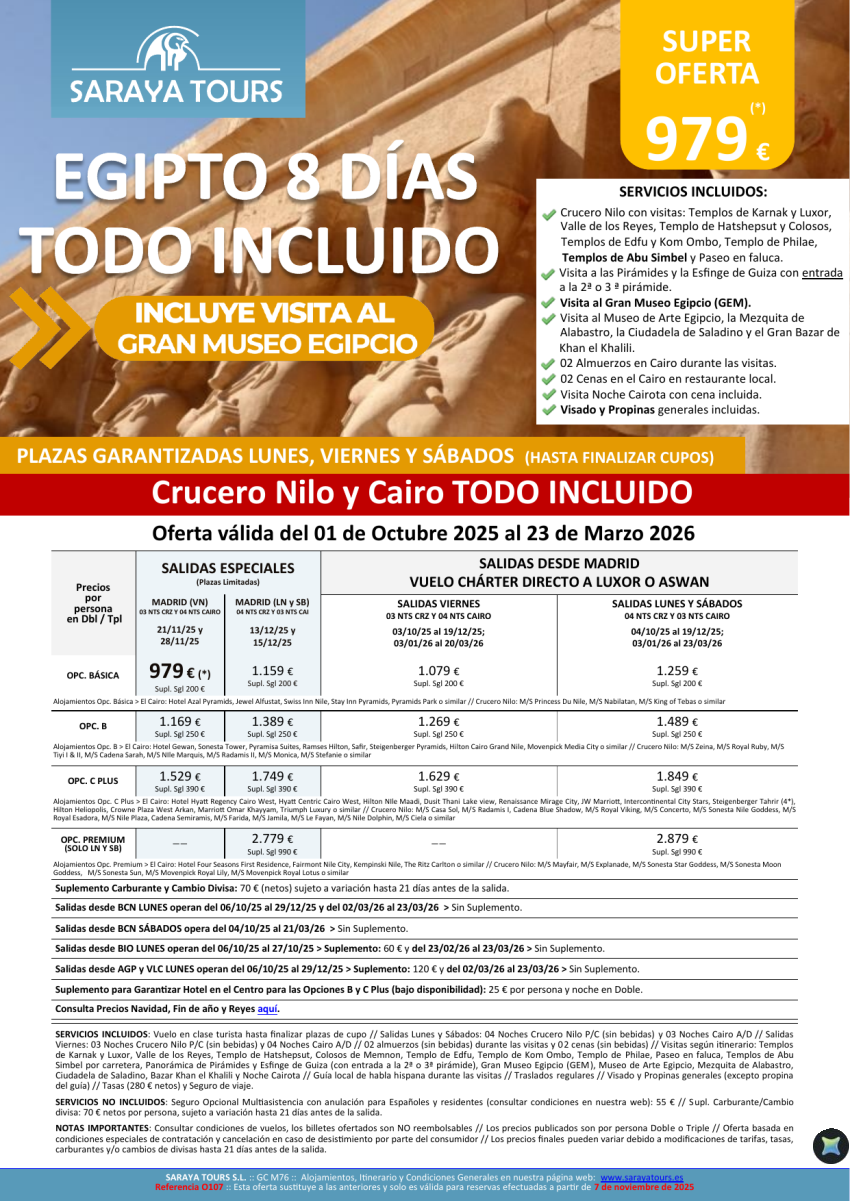 Egipto Todo Incluido 8d. *Salidas Mad,Bcn,Bio,Agp,Vlc* Crucero y Cairo+ visitas, Propinas y Visado. Desde 929€